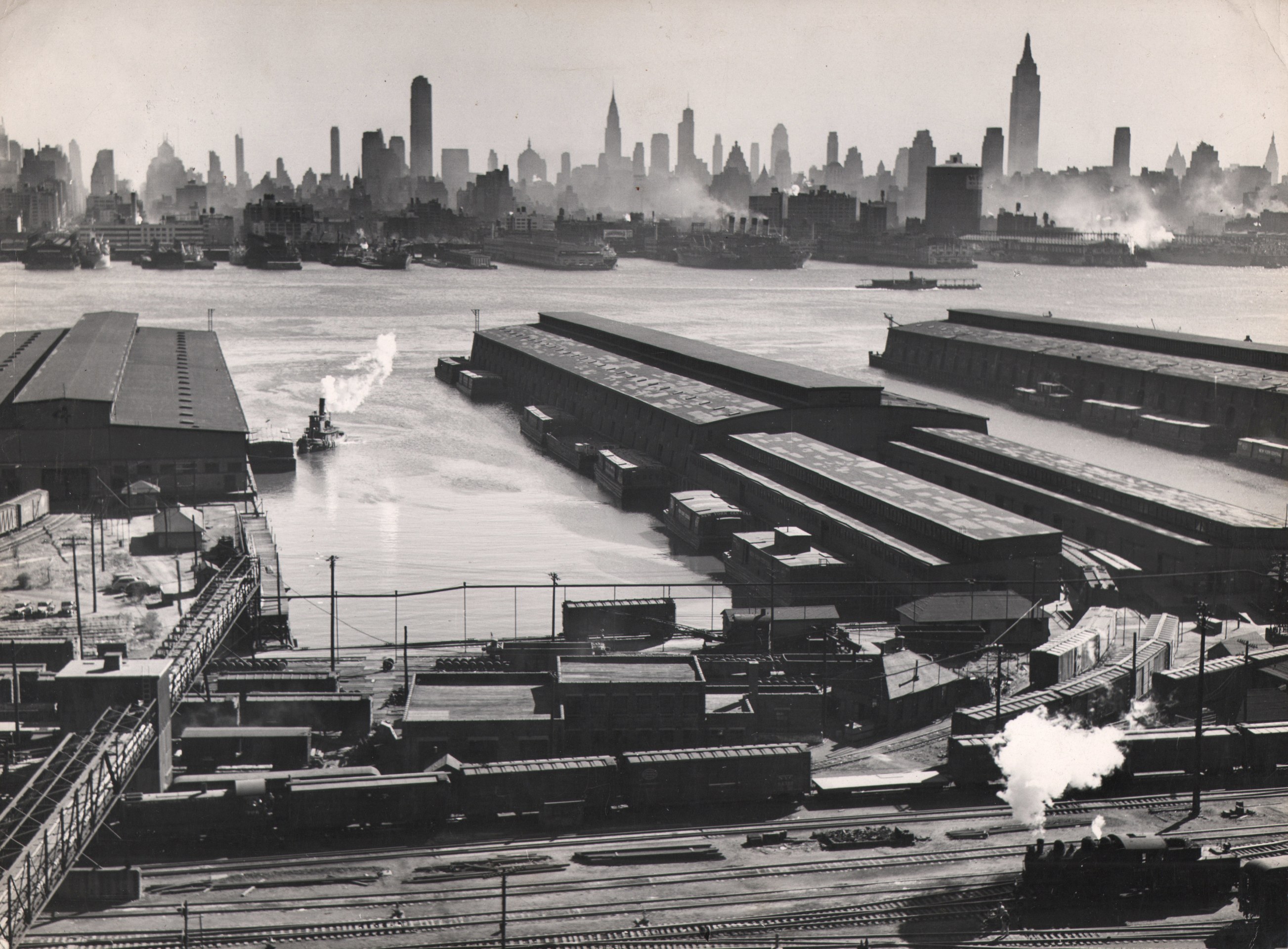 Esther Bubley, Weehawken, New Jersey. View looking east from 50th Street and East Boulevard showing New York Central piers, Hudson River and Midtown Manhattan skyline, 1946